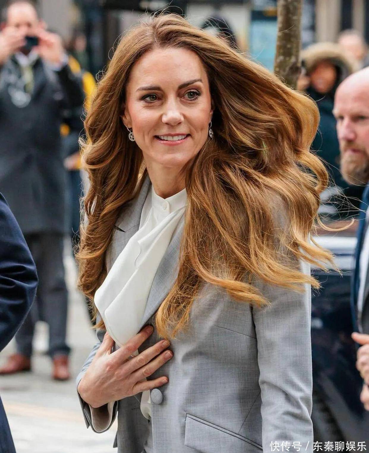 威尔士王妃凯特近日出席了一场公开活动,她身穿浅灰色职业套装,内搭白色荷叶领衬衫,整个人显得既干练又优雅。 最引人注目的是她那一头浅棕色的长波浪卷发,发量浓密,发缝自然,让之前关于她因化疗戴假发的传闻不攻自破。